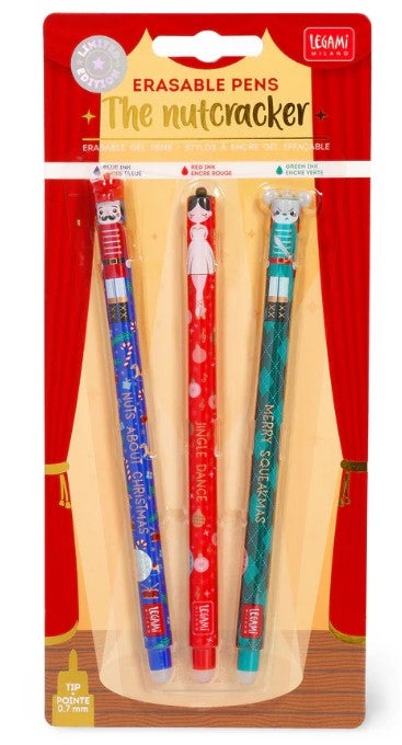 Jouluteemainen kolmen pyyhittävän geelikynän setti. Musteen väreinä sininen, punainen ja vihreä. Kynänkärki 0,7 mm. Kynän toisessa päässä kestokumi, jolla pyyhit musteen pois tarvittaessa.