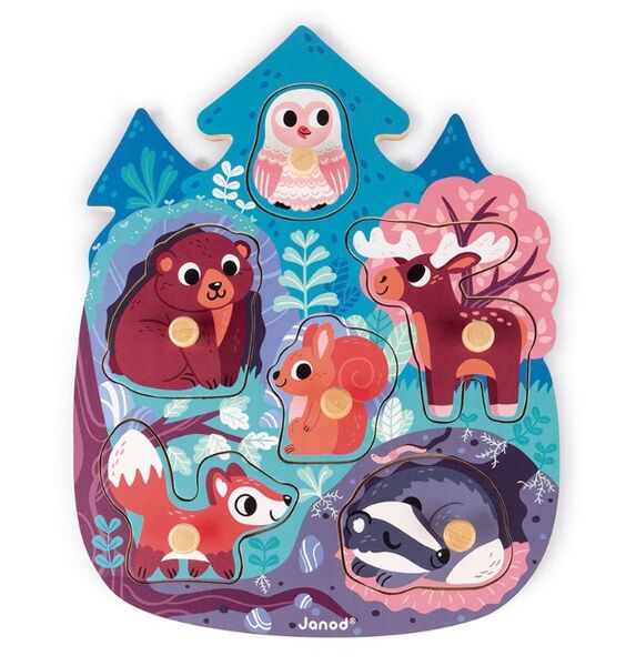 Janod Iloinen metsä nuppipalapeli on perinteinen, opettavainen lelu lasten leikkeihin. Nuppipalapeli sopii loistavasti pienen lapsen ensimmäiseksi palapeliksi. Sen isot ja selkeät puisella nupilla varustetut palat sopivat hyvin pienen lapsen käteen. Iloinen metsä -palapelissä seikkailee kuusi tuttua eläinhahmoa: pöllö, karhu, hirvi, orava, kettu ja mäyrä. Löydätkö oikean paikan kaikille eläinystäville?